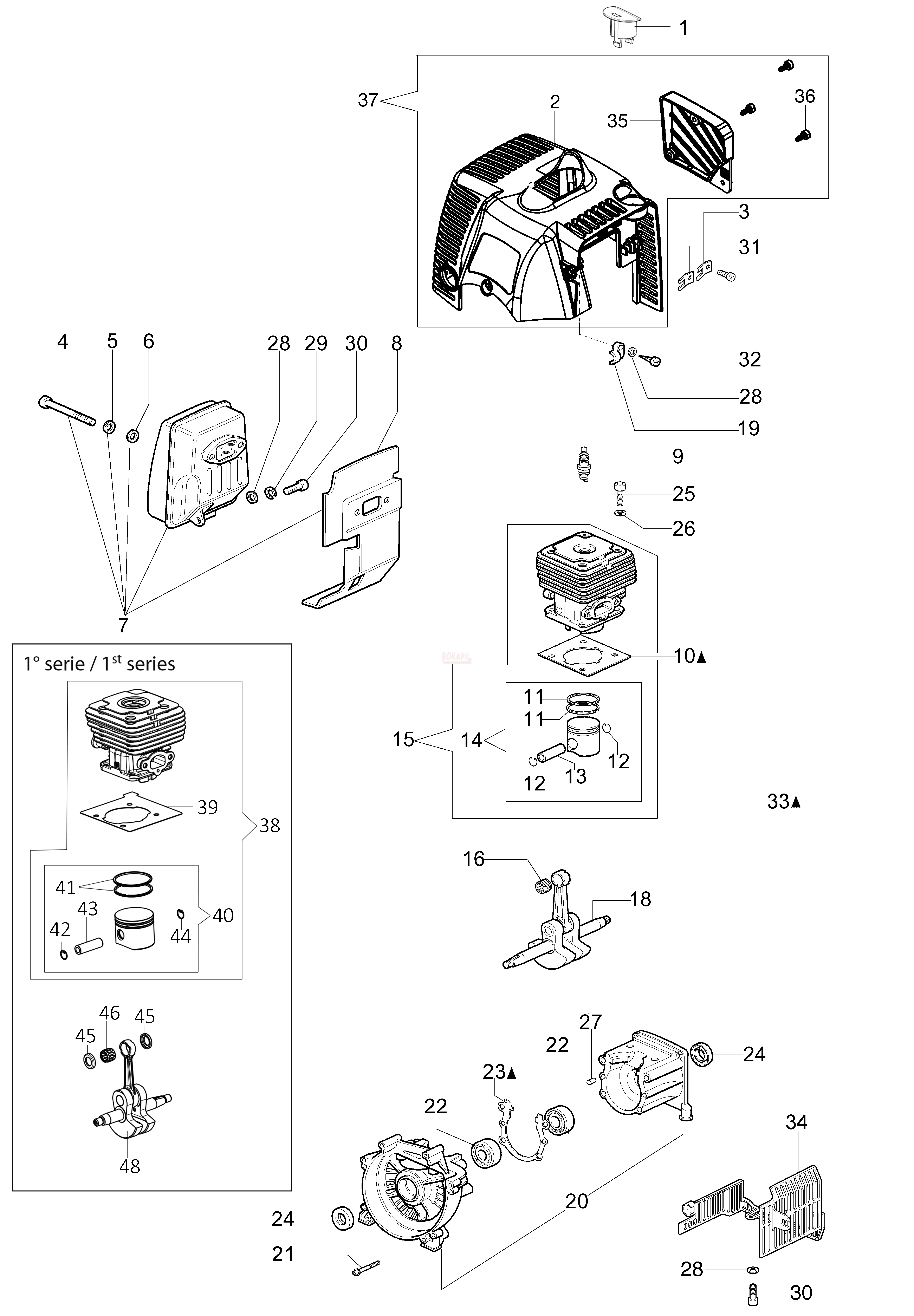 Silnik- cylinder, tłok, pierścienie, wał korbowy, skrzynia korbowa, tłumik, uszczelka, łożysko, uszczelniacz, pokrywa silnika, świeca - Kosy spalinowej Oleo-Mac - 741- schemat