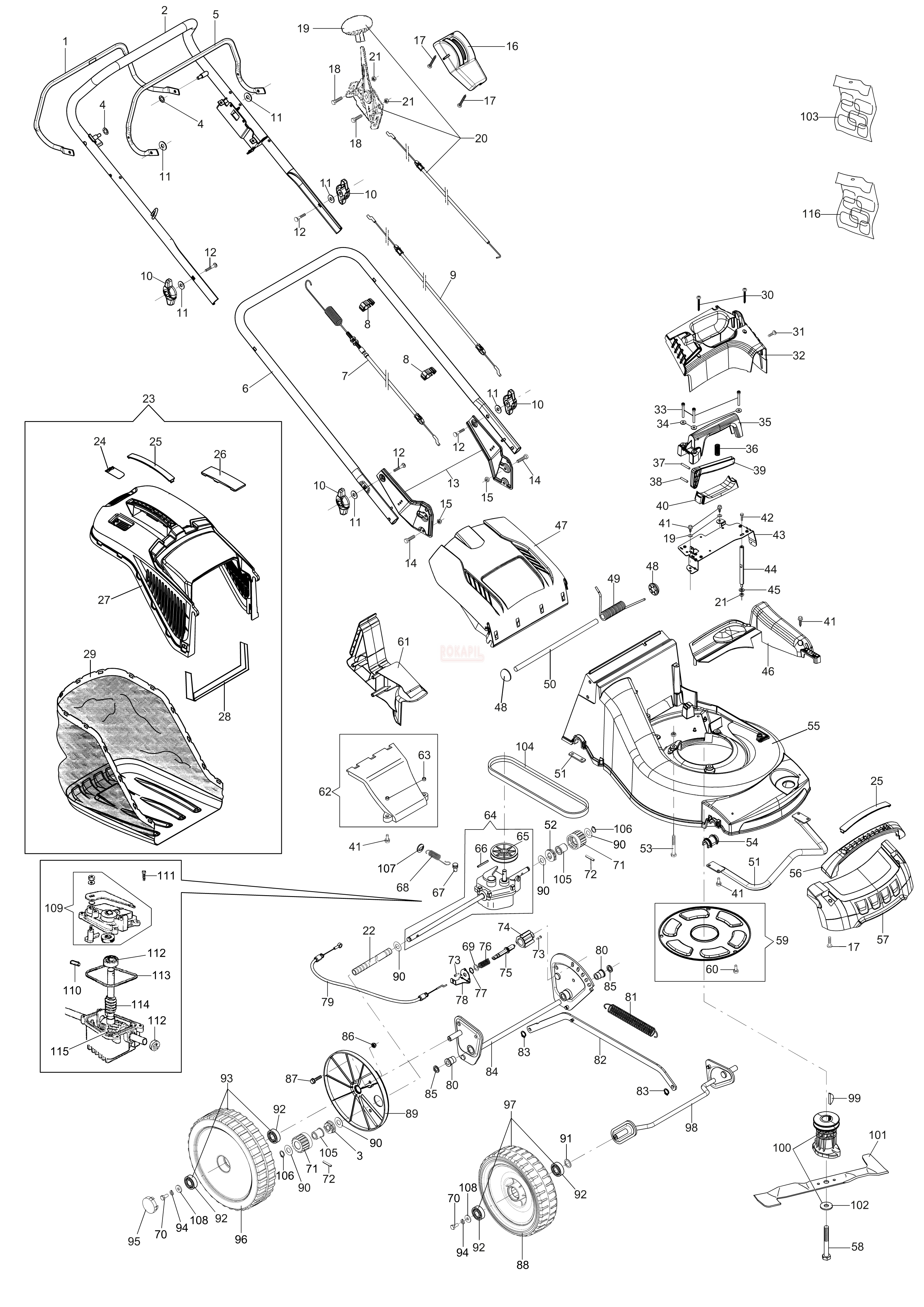 Części korpusu - nóż, piasta noża, kosz na trawę, linka gazu, linka hamulca, linka napędu, śruba, koło, pasek napędu, przekładnia napędu, uchwyt, dźwignia, podkładka- kosiarki spalinowej Oleo- Mac MAX 53 TK PRO ALU, MAX 53 TK ALUMINIUM PRO - schemat