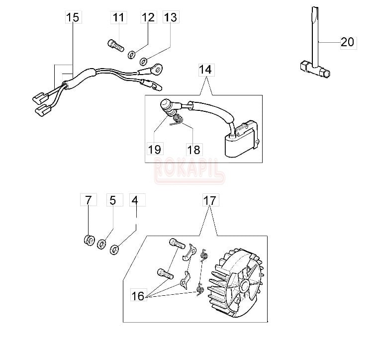 Części układu zapłonowego - cewka, koło magnesowe pilarki Oleo-Mac 937 - schemat