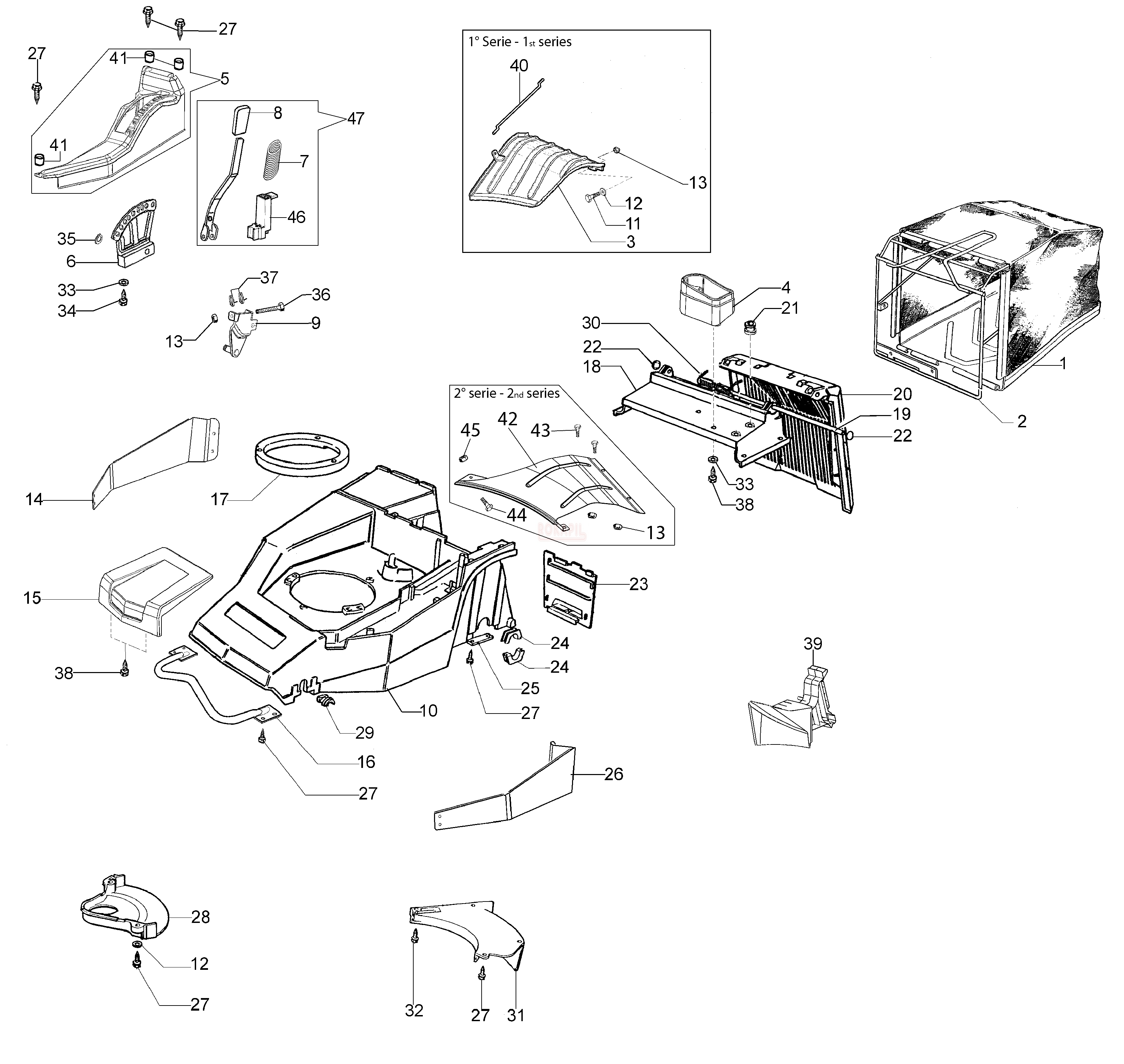 Korpus, osłona paska napędu, kosz na trawę, dźwignia wysokości koszenia kosiarki Oleo-Mac LUX 55 TBD - schemat