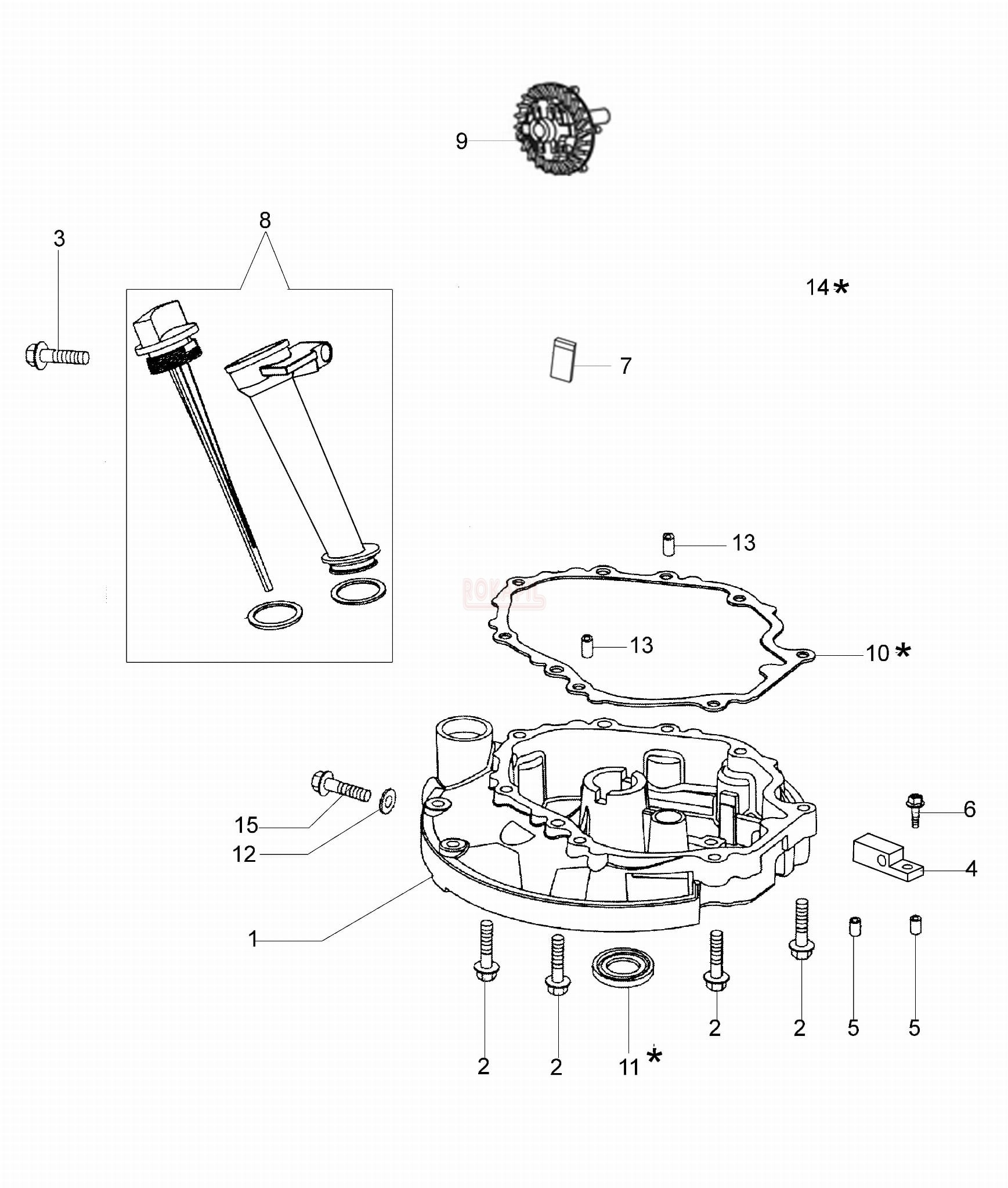 Miska olejowa, uszczelka miski, uszczelniacz, korek oleju, regulator obrotówi - kosiarki spalinowej Oleo- Mac G 44 TK (K500 - AUTOCHOKE)- schemat