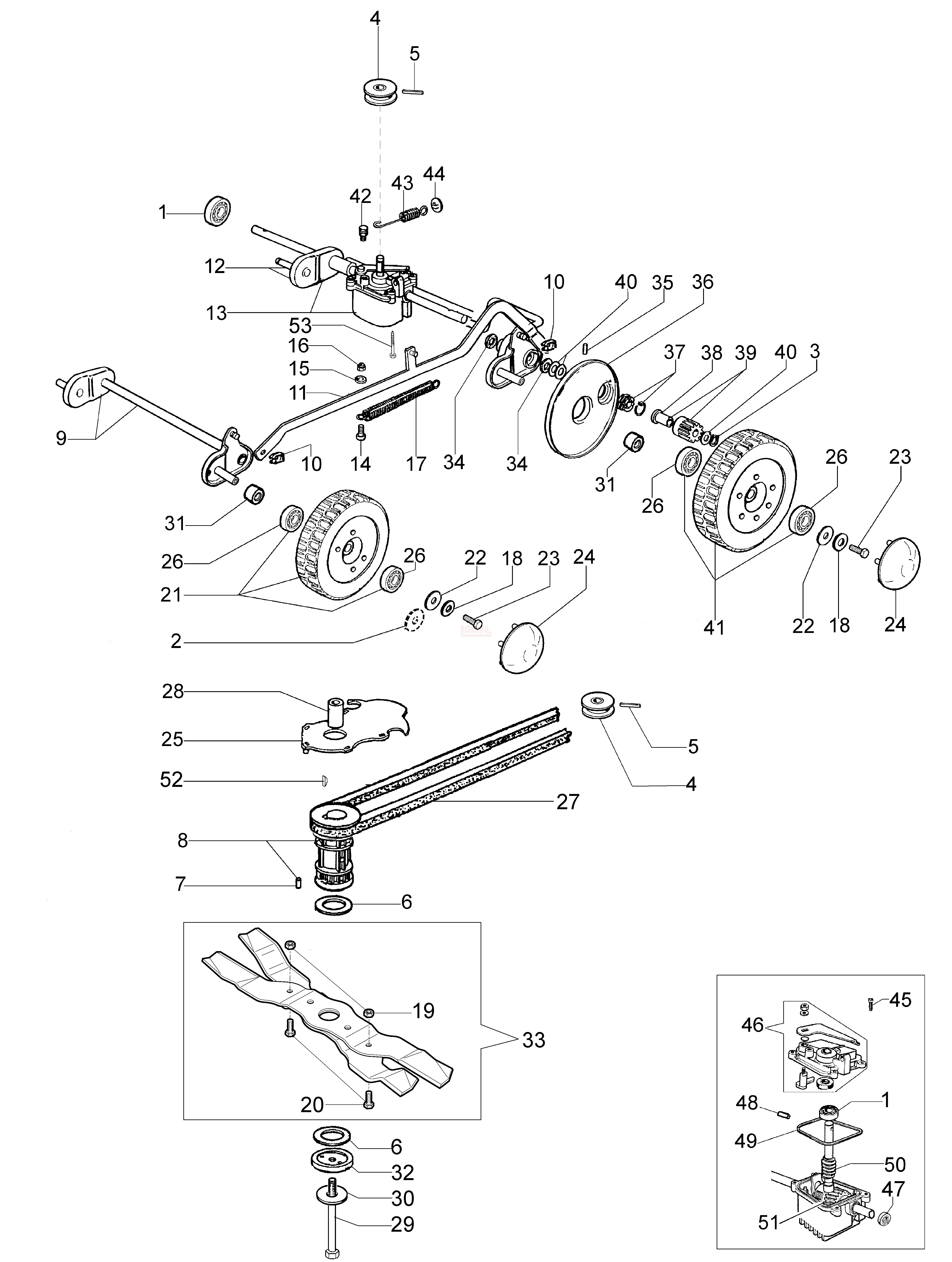 Oś przednia, oś tylna, przekładnia napędu, sprężyna, zębatka napędowa, koło przednie, koło tylne , pasek napędu, koło pasowe, uchwyt noża, nóż kosiarki Oleo-Mac LUX 55 TBD - schemat (produkcja do lutego 2013r. ! )