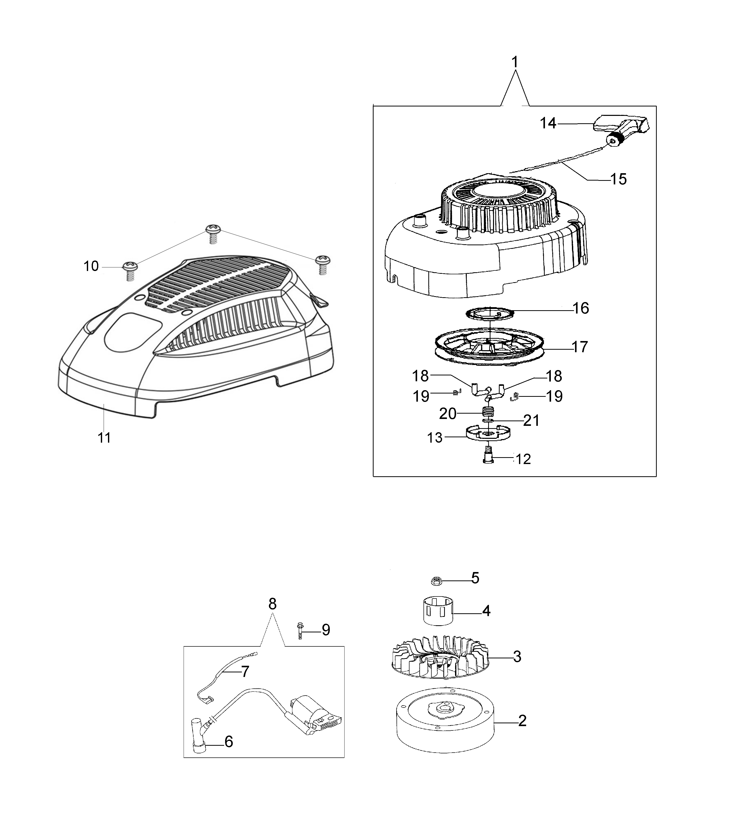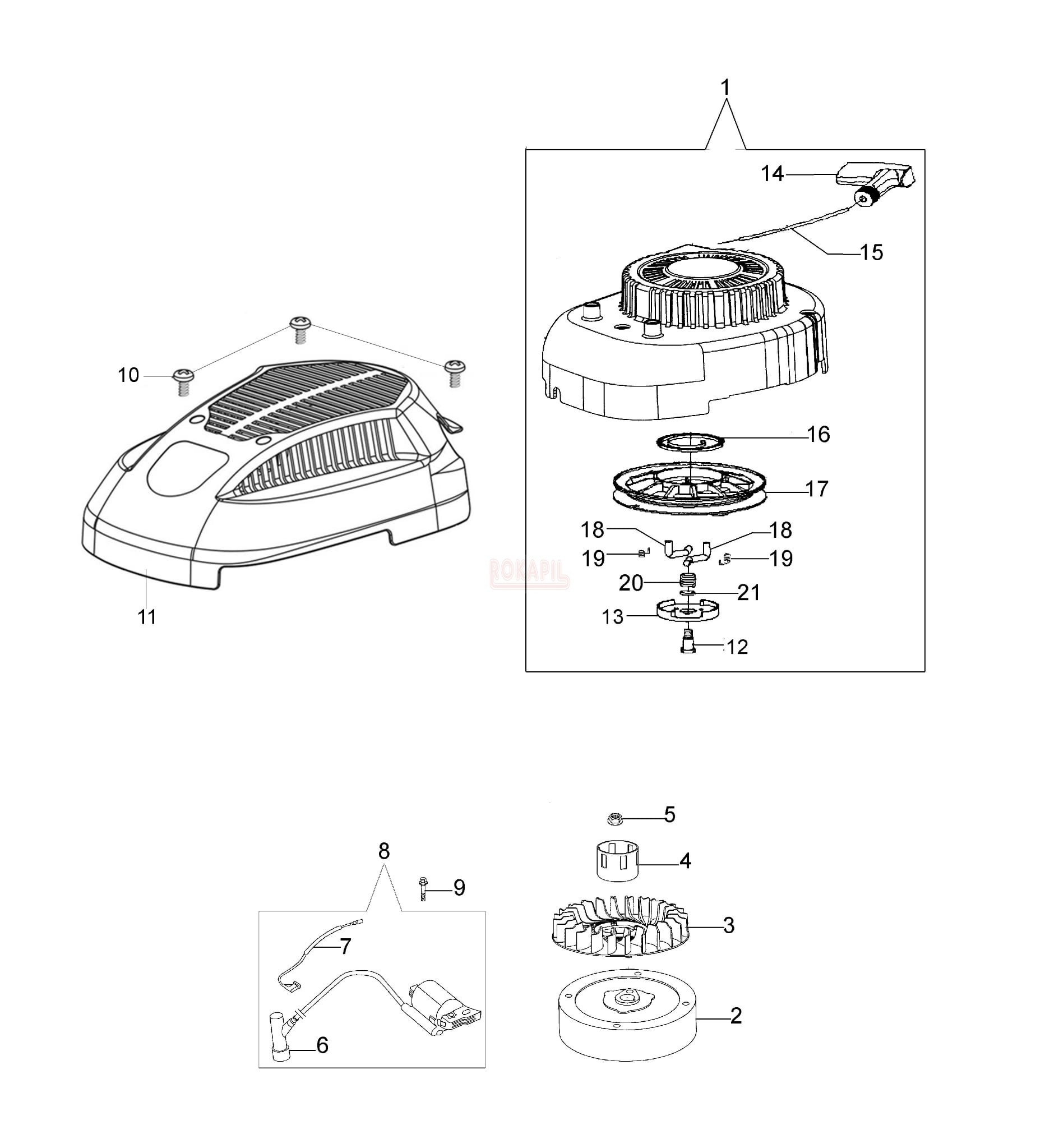 Rozrusznik, cewka, koło magnesowe, wentylator, zabieraki, pokrywa, koło linowe, zabieraki - kosiarki spalinowej Oleo- Mac G 44 TK COMFORT PLUS (K500)- schemat
