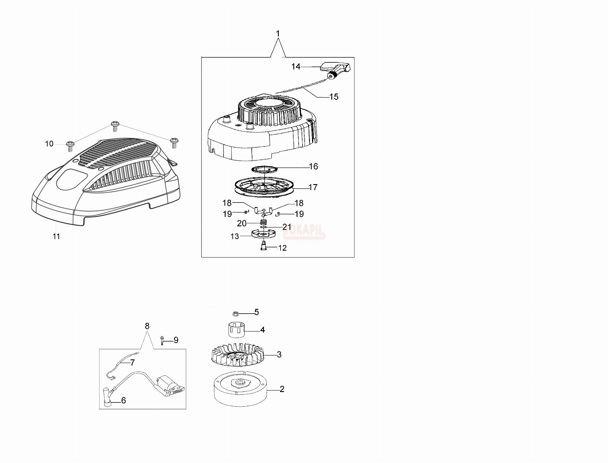 Rozrusznik, cewka, koło magnesowe, wentylator, zabieraki, pokrywa, koło linowe, zabieraki - kosiarki spalinowej Oleo- Mac G 44 TK (K500)- schemat