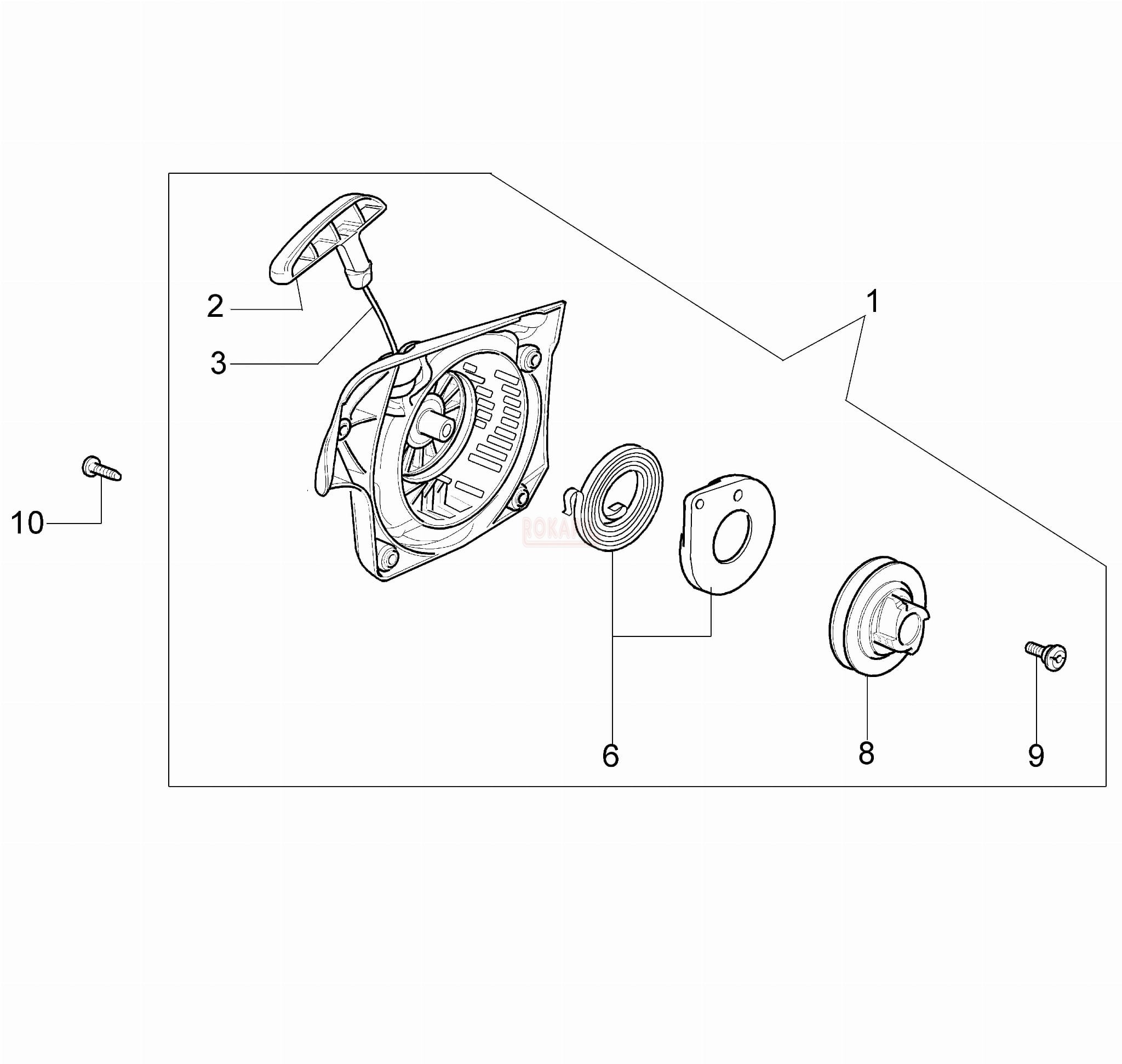 Rozrusznik, sprężyna, koło nawojowe, uchwyt, śruba - części pilarki Oleo-Mac GS 370 - schemat