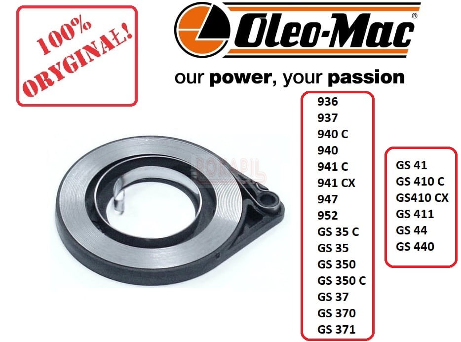 Sprężyna rozrusznika pilarki, piły spalinowej Oleo-Mac 936, 937, 940, 940C, 941C, 941CX, 947, 952, GS35, GS35C, GS350, GS350C, GS37, GS370, GS371, GS41, GS410C, GS410CX, GS411, GS44, GS440 - część ORYGINALNA!