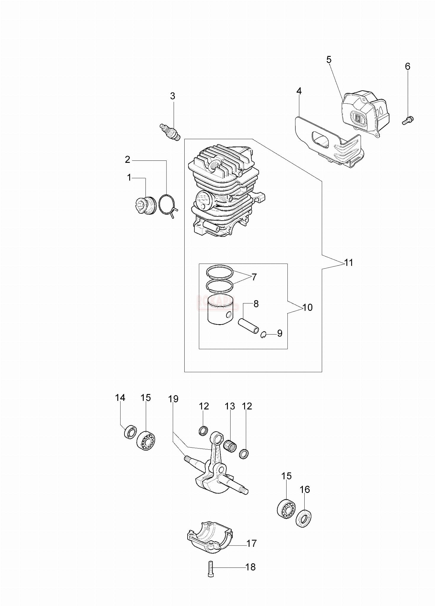 silnik części -cylinder, tłok, korbowód, tłumik, łożyska, uszczelniacze- pilarki Oleo-Mac GS 370 - schemat